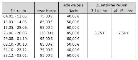 Die Preise sind inklusive 1*Bettwäsche & 2 Handtücher pro Person, Wasser, Strom und Heizung und gelten für eine Belegung mit bis zu 4 Personen.